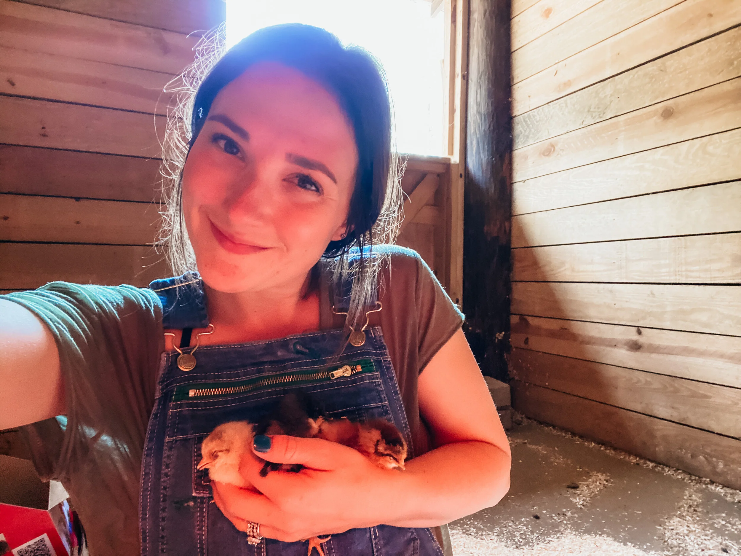 After researching, we chose a non-GMO Rainbow Ranger Broiler for our meat poultry. They are hatched from a line of chickens that have not been genetically modified and are fed an organic, non-GMO feed. We received them as days old chicks and placed them in our barn brooder. They will finish getting their feathers in the barn stall and then move directly to a chicken tractor on the pasture where they will finish out their days. We will move the tractor each day to be sure they have access to fresh grass and are not living on their waste.